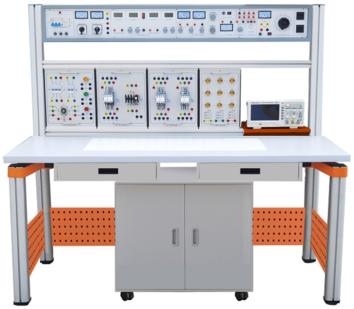 裝置由主機箱、實(shí)驗桌、實(shí)訓掛箱、獨立封裝實(shí)訓電路模塊、移動(dòng)矮柜、示波器架、學(xué)生凳等組成。實(shí)訓裝置支架與實(shí)訓桌可組合、可拆裝。支架與桌腳一體,鋁合金結構,實(shí)訓掛箱、各實(shí)驗模塊可根據實(shí)驗需求自由組合放置。