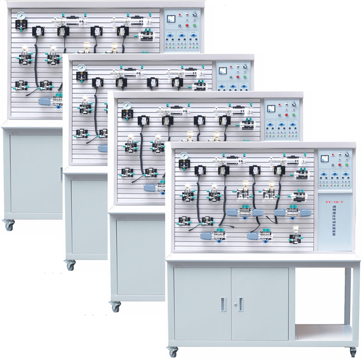 透明液壓實(shí)驗臺為實(shí)現液壓傳動(dòng)課程現代化教學(xué)而進(jìn)行研究的最新科技成果,它填補了技校、中專(zhuān)、大專(zhuān)院校的液壓傳動(dòng)透明教學(xué)設備的國家空白。液壓傳動(dòng)具有重量輕、功率大、結構簡(jiǎn)單、布局靈活、控制方便等特點(diǎn)、速度、扭矩、功率均可作無(wú)級調節,能迅速換向和變速,調速范圍寬,快速性好,工作平穩、噪音小,元器件已實(shí)現系列化、標準化,通用化等一系列優(yōu)點(diǎn),隨著(zhù)科學(xué)技術(shù)的發(fā)展,液壓傳動(dòng)作為一種可以傳遞動(dòng)力和控制的傳動(dòng)方式,已經(jīng)日益廣泛應用到醫療、科技、軍事、工業(yè)自動(dòng)化生產(chǎn)、起動(dòng)、運輸、礦山、建筑、航空等各個(gè)領(lǐng)域。為了適應在短暫課堂時(shí)間內,完成多個(gè)液壓油路的教學(xué)內容。同時(shí)對比演示多個(gè)不同油路的工作原理。而且,使油路系統的安裝調試有必要的程序且不占用上課教學(xué)時(shí)間。就必須有多臺設備同時(shí)工作。同時(shí),YY-18