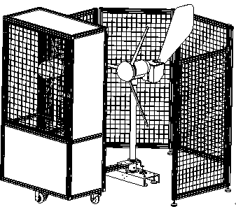 葉片、輪轂、發(fā)電機、機艙、尾舵和側風(fēng)偏航控制機構組裝成水平軸永磁同步風(fēng)力發(fā)電機,安裝在塔架上。風(fēng)場(chǎng)由軸流風(fēng)機、軸流風(fēng)機支架、軸流風(fēng)機框罩、測速儀、測速儀支架、風(fēng)場(chǎng)運動(dòng)機構箱體、傳動(dòng)齒輪鏈機構、單相交流電動(dòng)機、滾輪和萬(wàn)向輪組成。軸流風(fēng)機和軸流風(fēng)機框罩安裝在風(fēng)場(chǎng)運動(dòng)機構箱體上部,傳動(dòng)齒輪鏈機構、單相交流電動(dòng)機、滾輪和萬(wàn)向輪組成風(fēng)場(chǎng)運動(dòng)機構。當風(fēng)場(chǎng)運動(dòng)機構中的單相交流電動(dòng)機旋轉時(shí),傳動(dòng)齒輪鏈機構帶動(dòng)滾輪轉動(dòng),風(fēng)場(chǎng)運動(dòng)機構箱體圍繞風(fēng)力發(fā)電機的塔架作圓周旋轉運動(dòng),當軸流風(fēng)機輸送可變風(fēng)量風(fēng)時(shí),在風(fēng)力發(fā)電機周?chē)纬娠L(fēng)向和風(fēng)速可變的風(fēng)場(chǎng)。