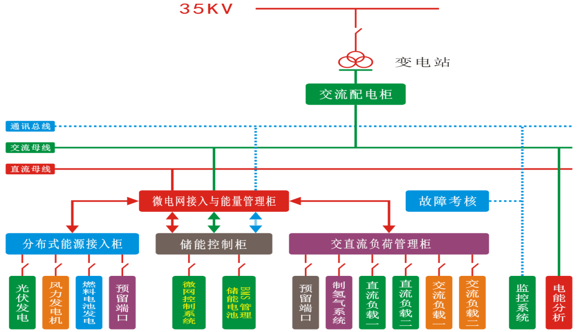 設備由能量調度控制器、浪涌保護器、交流接觸器、斷路器、單相計量?jì)x表、電流互感器、工業(yè)觸摸屏(HMI)、測試端子等組成。主要完成微電網(wǎng)與電網(wǎng)能量交互的控制、計量與保護,同時(shí)通過(guò)能量調度控制器對儲能、分布式電源、交直流負荷等進(jìn)行能量管理與調度,實(shí)現微電網(wǎng)平滑穩定、經(jīng)濟高效運行。