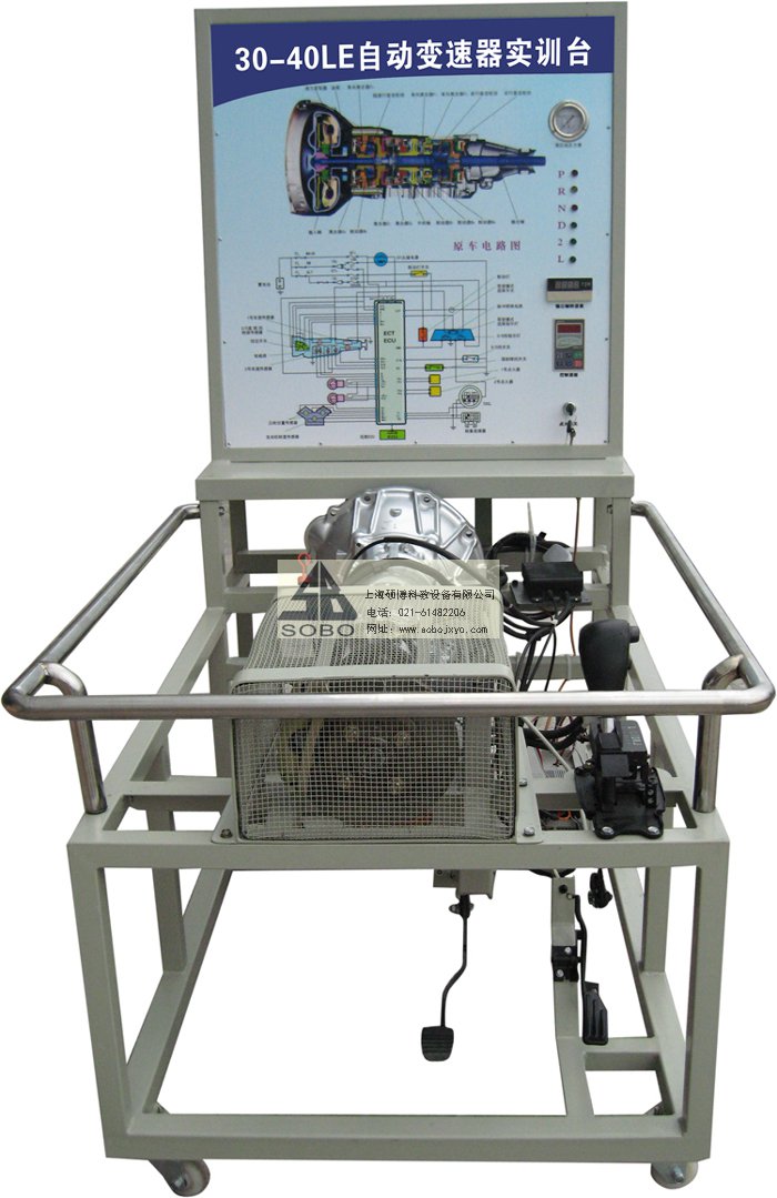 本變速器實(shí)訓臺是本公司采用豐田后驅A340E自動(dòng)變速器為適應汽車(chē)教學(xué)需求而研制的,該實(shí)訓臺由電控變速器(八成新)、操作顯示面板及發(fā)動(dòng)機彩色電氣原理圖電腦控制柜、可移動(dòng)式臺架(萬(wàn)向腳輪)、驅動(dòng)系統(腳踏式油門(mén)踏板)變頻電機驅動(dòng)、啟動(dòng)系統(電門(mén)鎖方式啟動(dòng))、車(chē)速傳感器、電磁閥執行器、原車(chē)電腦、具有發(fā)動(dòng)機運轉及顯示(轉速.車(chē)速.檔位)、液壓油壓力顯示表(顯示換檔過(guò)程油壓)、自動(dòng)變速器電磁閥工作指示LED燈、故障設置區可設置12路故障(老師設置任一路線(xiàn)路故障)、故障排除區(學(xué)生通過(guò)各種儀器、儀表、)在面板上用專(zhuān)用排故線(xiàn)連接排除故障、傳感器信號模擬等多項功能、具結構緊湊、操作方便、安全可靠、教學(xué)直觀(guān)、是汽車(chē)自動(dòng)變速器實(shí)物教學(xué)不可缺少的實(shí)驗室設備之一。