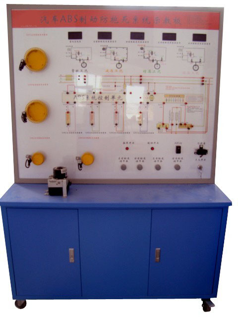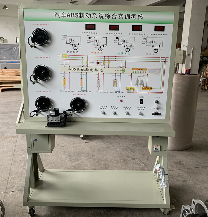 ABS控制單元、ABS電磁閥總成、輪速傳感器、制動(dòng)開(kāi)關(guān)等。檢測端子、故障設置系統、大容量蓄電池或12V開(kāi)關(guān)電源、大型彩色噴繪電路原理圖、控制面板、可移動(dòng)臺架、使用說(shuō)明書(shū)及任務(wù)驅動(dòng)式實(shí)訓指導書(shū)等。