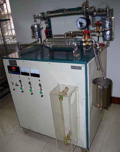 電蒸汽鍋爐、套管換熱器、蒸汽冷凝罐、蒸汽及水流量測試設備、加熱由固體調壓模塊無(wú)級調節,由多路巡檢儀顯示的溫度測試系統,不銹鋼臺架及控制屏等。