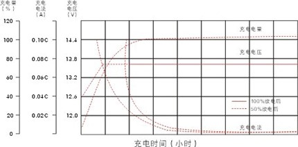鉛酸蓄電池要求采用限流恒壓的充電方法進(jìn)行充電。在環(huán)境度為25℃的條件下,最佳的浮充電壓為13.6±0.1V 臺X臺數,充電開(kāi)始時(shí)的電流應限制在0.25C10A的范圍內。