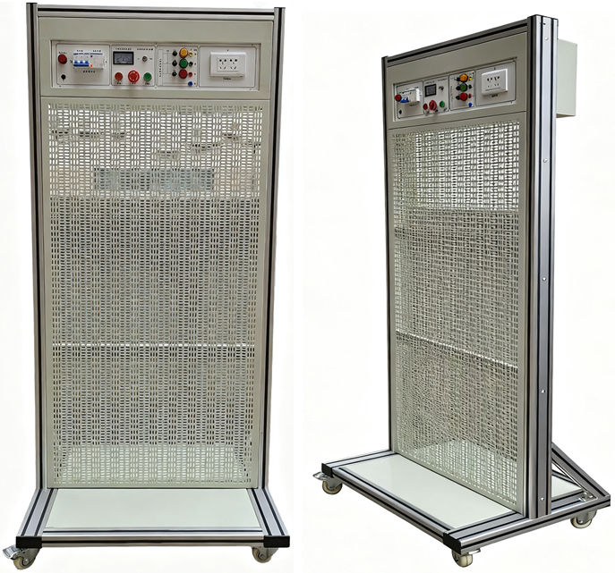 電氣實(shí)訓裝置,屬于職業(yè)教育或技能培訓中用于電氣安裝、調試等實(shí)操訓練的設備。采用鋁型材框架,搭配鏤空面板,底部有帶輪底座便于移動(dòng);頂部設有控制區域,包含斷路器、儀表、按鈕、插座等電氣元件,可模擬實(shí)際電氣系統的控制與供電場(chǎng)景。