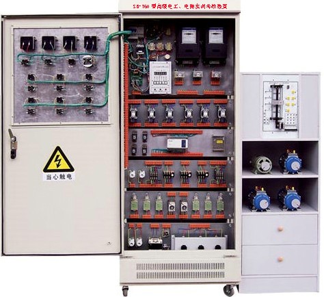 該裝置按標準電氣控制柜設計制造規格,充分利用雙面位置,柜內裝有完成各種照明電路所需的單相電度表、日光燈、單聯(lián)開(kāi)關(guān)、插座、感應開(kāi)關(guān)、漏電開(kāi)關(guān)等,以及電氣控制所需要的多種低壓電器,如漏電斷路器、熔斷器、電流互感器、交流接觸器、時(shí)間繼電器、熱繼電器、中間繼電器、行程開(kāi)關(guān)、按鈕、信號燈、轉換開(kāi)關(guān)、電壓表、電流表、功率表及電度表等,為了延長(cháng)電器使用壽命,各電器的接點(diǎn)都與接線(xiàn)端子相連,再由接線(xiàn)端子與被控制電氣連接。