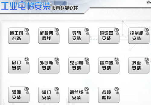 電梯模型:包含驅動(dòng)裝置、轎廂及對重裝置、導向系統、門(mén)機機構、安全保護機構等組成。驅動(dòng)裝置由曳引機(帶有制動(dòng)器、減速機、導向輪、工業(yè)編碼器)、曳引鋼絲繩和繩頭組合等部件組成;導向系統由井道鋼架、導軌、導靴等組成;門(mén)機機構由轎門(mén)、層門(mén)、開(kāi)關(guān)門(mén)機構、安全觸板、門(mén)套等部件組成;安全保護機構由超載裝置、緩沖器、安全鉗、限速保護裝置等部件組成。