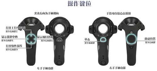 工業(yè)電梯安裝VR實(shí)訓系統中所有交互均采用虛擬現實(shí)頭顯和手柄完成。其中頭顯的主要功能是控制場(chǎng)景中人物的位置和屏幕顯示的方向,手柄的主要功能包括與界面交互的"扳機建"、移動(dòng)手柄進(jìn)行觸碰、左手點(diǎn)擊輪盤(pán)進(jìn)行呼出和移動(dòng)功能鍵。