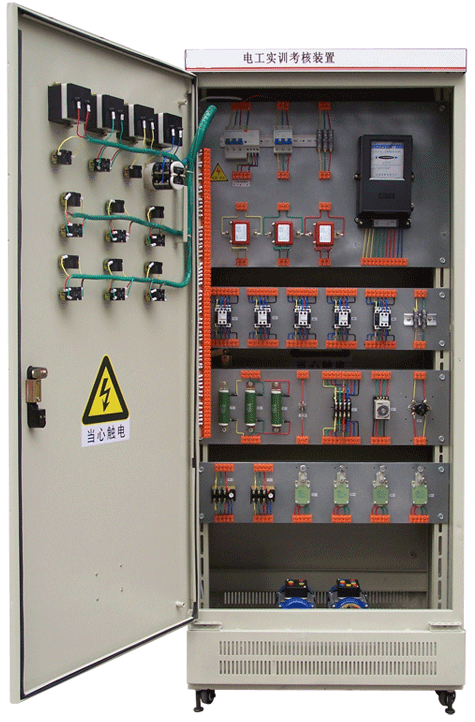 該裝置按標準電氣控制柜設計制造規格,充分利用雙面位置,柜內裝有完成各種照明電路所需的單相電度表、日光燈、單聯(lián)開(kāi)關(guān)、插座、感應開(kāi)關(guān)、漏電開(kāi)關(guān)等,以及電氣控制所需要的多種低壓電器,如漏電斷路器、熔斷器、電流互感器、交流接觸器、時(shí)間繼電器、熱繼電器、中間繼電器、行程開(kāi)關(guān)、按鈕、信號燈、轉換開(kāi)關(guān)、電壓表、電流表、功率表及電度表等,為了延長(cháng)電器使用壽命,各電器的接點(diǎn)都與接線(xiàn)端子相連,再由接線(xiàn)端子與被控制電氣連接。
