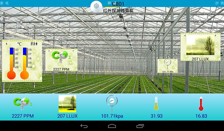 3、環(huán)境檢測系統:通過(guò)二氧化碳傳感器、大氣壓力傳感器、光照強度傳感器、溫濕度傳感器,配合智能網(wǎng)關(guān)環(huán)境檢測系統軟件,實(shí)現農業(yè)大棚環(huán)境檢測系統等物聯(lián)網(wǎng)綜合應用系統。
