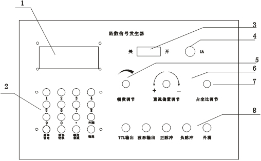 1)、液晶顯示屏,用于顯示設置頻率、輸出波形類(lèi)型、衰減幅度、外測頻率等。