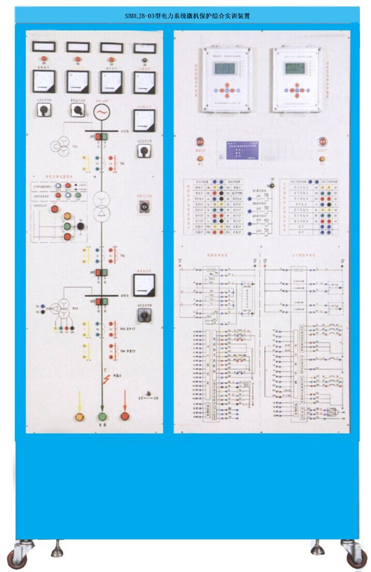 電力系統微機保護綜合實(shí)訓裝置,電力系統微機保護綜合實(shí)訓柜是針對職業(yè)院校的電力技術(shù)類(lèi)專(zhuān)業(yè)“電力系統繼電保護”、“電力系統微機保護”及相關(guān)專(zhuān)業(yè)課程設計的綜合型實(shí)訓裝置。該實(shí)訓裝置采用電力工程中廣泛應用的微機線(xiàn)路測控裝置和微機變壓器測控裝置,配置模擬一次系統(含輸電線(xiàn)路、電力變壓器、負載阻抗、短路阻抗)、三相可調電源調壓器、系統故障設置模塊、智能故障設置排除及考核裝置等功能模塊,可以完成微機線(xiàn)路、微機變壓器保護裝置的特性測試、接線(xiàn)、以及線(xiàn)路保護、變壓器保護的參數整定設置、運行等方面的實(shí)訓和考核項目。本裝置可用于電力行業(yè)培訓,也可以用于職業(yè)院校等相關(guān)專(zhuān)業(yè)的實(shí)訓教學(xué)。