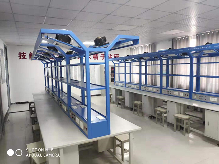 實(shí)訓臺上提供日光燈(用于照明)2個(gè),透明的PVC板4個(gè),可夾放原理圖等資料,另外還配備三芯雙聯(lián)暗插座4個(gè)、兩芯暗插座2個(gè)、工具柜2個(gè),工作臺面設有綠色防靜電桌墊,整個(gè)裝配線(xiàn)安全可靠。