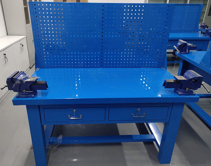 1. 鉗工桌臺面采用50mm厚刨花板壓制而成, 堅固耐用,韌性強.可根據用戶(hù)需求可選配1.2mm鍍鋅板放置于桌面上,效果更佳.
