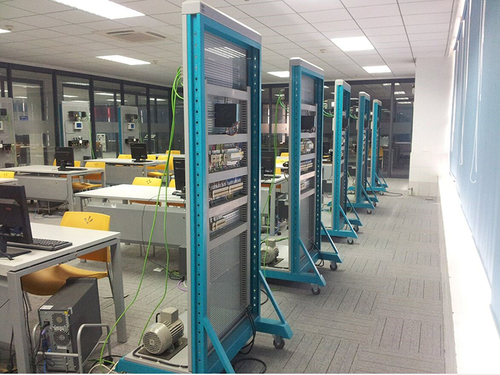 鋼材框架與網(wǎng)控板均采用雙層亞光密紋噴塑結構,網(wǎng)孔板上可以根據任務(wù)要求調整上面安裝的設備,自動(dòng)化設備包括PLC、人機界面、變頻器、工業(yè)交換機、導軌式開(kāi)關(guān)電源等目前工業(yè)控制系統上最常用的設備,完成電氣控制線(xiàn)路的連接。