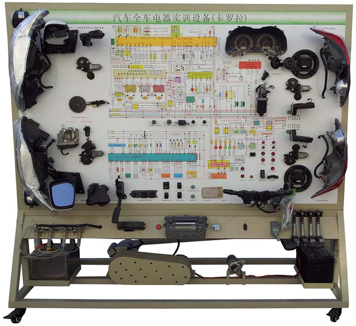 2.設備面板采用耐創(chuàng )擊、耐污染、防火、防潮的高級鋁塑板,表面經(jīng)特殊工藝噴涂底漆處理;面板打印有永不褪色的彩色電路圖;學(xué)員可直觀(guān)對照電路圖和實(shí)物,認識和分析汽車(chē)整車(chē)電器各系統的工作原理。