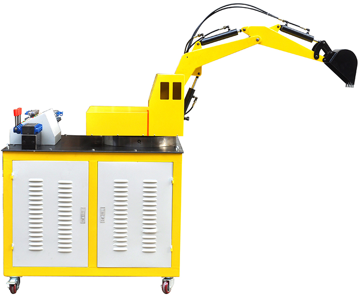 工業(yè)型挖掘機液壓實(shí)訓臺能模擬真實(shí)挖掘機工作裝置和回轉機構的各種動(dòng)作,最高工作壓力可達7MPa,實(shí)訓臺由液壓挖掘機工作裝置、回轉機構、液壓傳動(dòng)系統、電器控制器件、可編程控制器(PLC)和實(shí)訓桌組成,可實(shí)現挖掘、提升、回轉、卸料等典型動(dòng)作。其中,液壓傳動(dòng)系統配備手動(dòng)、PLC控制兩種方式,分別由四組手動(dòng)換向閥和電磁換向閥實(shí)現。通過(guò)操控本實(shí)訓臺,學(xué)生可以清晰地了解單斗液壓挖掘機的液壓元件組成、液壓回路工作原理、典型動(dòng)作控制方式和機械結構。