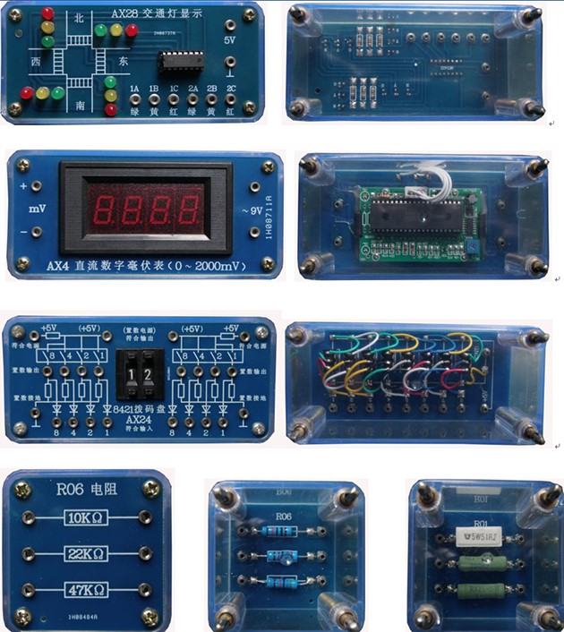實(shí)訓模塊由透明元件盒及PCB板構成,元件盒是組合式透明元件盒,元件盒單元組采用多元件、典型實(shí)訓單元電路、典型傳感器、通用集成電路插座等制成,可根據實(shí)訓需要方便地組合成不同的電工電子實(shí)訓線(xiàn)路;使實(shí)訓具有開(kāi)放性和創(chuàng )新性,元件盒體由透明有機工程塑料注塑而成,具有示教功能,使使用者能夠觀(guān)察到元件形狀和接線(xiàn)方式,有利于教師講解和學(xué)生認識;面板采用PCB制作而成,表面清爽、符號線(xiàn)路清晰、表面耐磨損、元件更換容易;面板上標志的元件電路符號采用最新國家標準,具有整體結構緊湊、外形美觀(guān)大方、安裝簡(jiǎn)單、使用保管方便等特點(diǎn)。導線(xiàn)插孔采用防轉座,導線(xiàn)裝有彈性插頭可在模塊上面插接,以保證可靠連接進(jìn)行各種實(shí)訓;實(shí)訓時(shí)可根據實(shí)訓內容和技能訓練的需要,方便的任意組合實(shí)訓線(xiàn)路,以完成不同的實(shí)訓項目等。