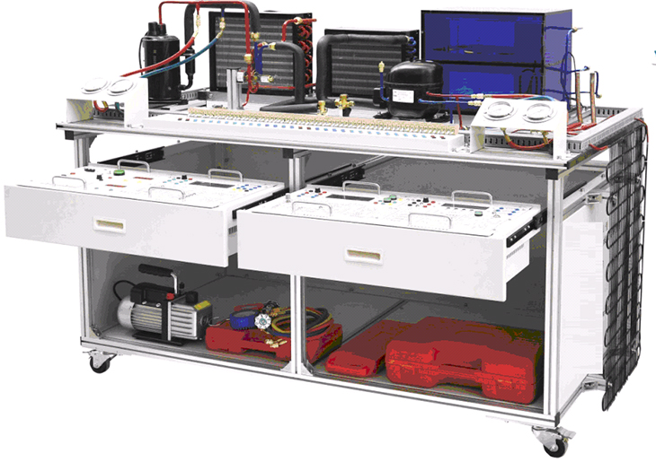 1、制冷制熱實(shí)訓臺采用鋁型材臺架加實(shí)訓模塊結構,裝置采用一體化設計,由導軌式 鋁合金安裝平臺、空調系統、電冰箱系統、電氣控制系統等組成。底部安裝有四個(gè)帶剎車(chē)的腳輪,可以方便的移動(dòng)和固定。設備配置空調制冷系統管路1套、直冷電冰箱制冷系統管路1套、安全插端子排,壓力表(1.5MPa)