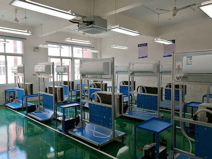 制冷實(shí)訓裝置、空調維修調試實(shí)訓設備為空調維修理實(shí)一體化實(shí)訓設備,承擔空調器維修實(shí)訓任務(wù)。主要設備有熱泵型定頻空調實(shí)訓考核裝置、變頻空調實(shí)訓考核裝置、空氣源熱泵熱水器及現代制冷與空調系統技能實(shí)訓裝置。學(xué)生通過(guò)實(shí)訓掌握熱泵空調制冷系統組成、工作原理,電路系統組成、工作原理,并通過(guò)執行器電路接線(xiàn)與測量、故障設置與排除故障等一系列的實(shí)訓,鞏固和提高了理論知識,增強了動(dòng)手能力,逐步訓練空調器維修的專(zhuān)業(yè)技能。