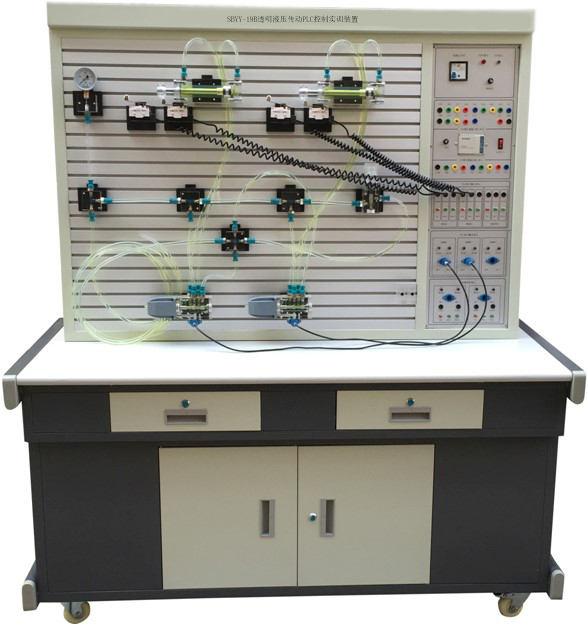 1、液壓PLC控制實(shí)訓裝置主要由實(shí)訓桌、實(shí)訓臺、液壓元件和電器控制器件、可編程控制器(PLC)等組件組成。