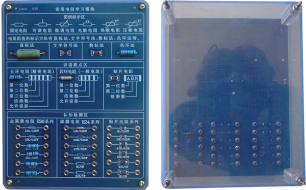 底盒使用190mm×145mm的開(kāi)模有機透明塑料底盒,模塊面板采用印制電路板PCB工藝,可以直觀(guān)看到器件的實(shí)物及相關(guān)的原理介紹。對于典型應用及易損器件安裝在面板背面,透過(guò)透明底盒能夠看到器件實(shí)物,方便感性認識、檢測測試,同時(shí)也能防止器件的損傷。