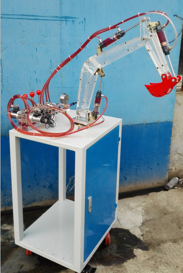 實(shí)訓臺主要由底柜,透明大臂,透明斗桿,透明挖斗(紅色),透明油缸,透明集成閥島,透明手動(dòng)換向閥,透明電磁閥,旋缸馬達,減速器等成
