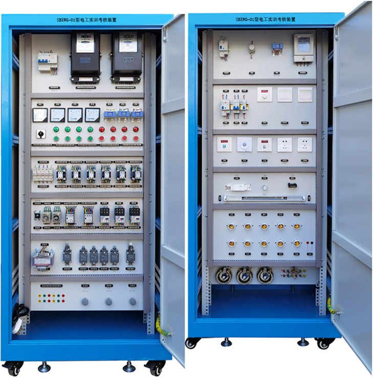 該設備按照標準電氣控制柜設計制造(規格:800×600×1800mm),利用雙面空間位置,柜內裝有完成各種照明電路所需的單相電度表、日光燈、白熾燈、單聯(lián)開(kāi)關(guān)、感應開(kāi)關(guān)、聲控開(kāi)關(guān)、觸摸開(kāi)關(guān)、插座等,以及電氣控制所需要的多種低壓電器,如漏電斷路器、熔斷器、電流互感器、接觸器、中間繼電器、時(shí)間繼電器、熱繼電器、行程開(kāi)關(guān)、按鈕、信號燈、轉換開(kāi)關(guān)、電壓表、電流表以及三相四線(xiàn)有功電度表等。為了延長(cháng)電器的使用壽命,降低材料消耗,各電器的接點(diǎn)都已與接線(xiàn)端子相連,學(xué)生只需在接線(xiàn)端子上接線(xiàn)訓練,以求電氣元件經(jīng)久耐用。技訓柜還配備多臺附屬電機,通過(guò)該電動(dòng)機支持可作各種實(shí)驗。