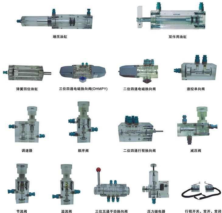 4、實(shí)訓元件均為透明有機材料制成,便于了解掌握幾十種常用液壓元件的結構,性能及用途。掌握幾十種基本回路的工作原理,實(shí)驗組裝回路快捷、方便。