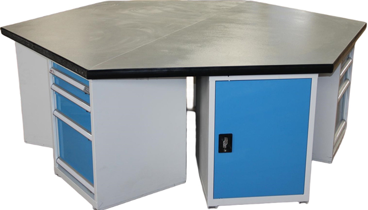 六角鉗工臺的工位長(cháng)為1.2米,每臺由兩個(gè)梯形鉗工臺拼成,共有18實(shí)訓工位。 |