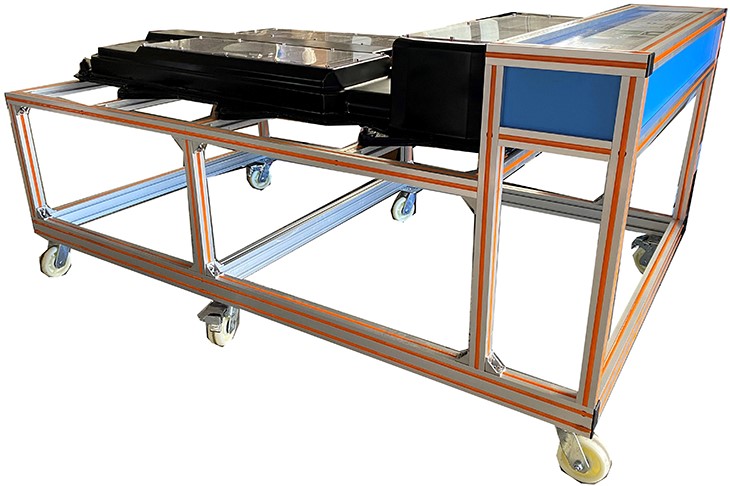 8.設備框架采用40mm×40mm和40mm×80mm兩種一體化全鋁合金型材搭建,耐油耐腐蝕并易于清潔,經(jīng)久耐用不生銹,帶萬(wàn)向腳輪,便于移動(dòng),并帶鎖止機構。