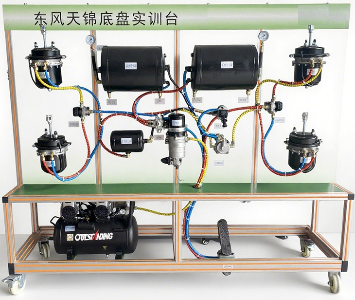 1.天錦全車(chē)氣路實(shí)訓臺采用全新東風(fēng)天錦EQ1120GA2 原車(chē)零部件有空氣壓縮機總成、空氣干燥劑、前橋儲氣筒、后橋儲氣筒、手制動(dòng)儲氣筒、再生儲氣筒、輔助儲氣筒、四回路保護閥、制動(dòng)腳閥、駐車(chē)閥、繼動(dòng)閥、制動(dòng)管路、氣壓表若干個(gè)。