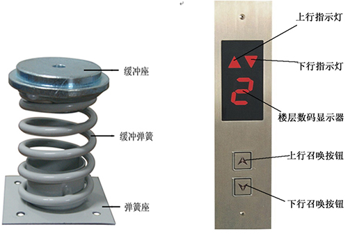 電梯井道部分:導軌、對重機構、轎廂(門(mén)機機構、安全鉗、導靴、照明燈、風(fēng)扇)、層門(mén)、樓層召喚指示控制器、曳引繩、導向輪、上(下)強慢開(kāi)關(guān)、上(下)限位開(kāi)關(guān)、上(下)極限開(kāi)關(guān)、隨行電纜、轎廂控制器、緩沖器。