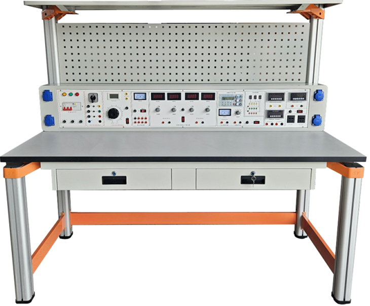 實(shí)訓桌后面二支截面尺寸70×70mm桌腳向上延伸,與一次成型鋁壓鑄框架連接構件構成(非焊接工藝)牢固的支架,與網(wǎng)孔工具掛板、儀器架、電源控制箱組成一個(gè)完整的實(shí)訓屏。