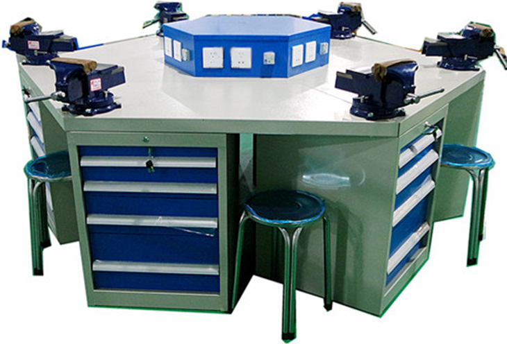 該六工位鉗工桌可以使學(xué)生完成常用工具的認識和使用,包括錘、鋸、銼、鑿、劃線(xiàn)、裝配、調試、安裝、維修等,可有效提高學(xué)生的操作水平和動(dòng)手能力。
