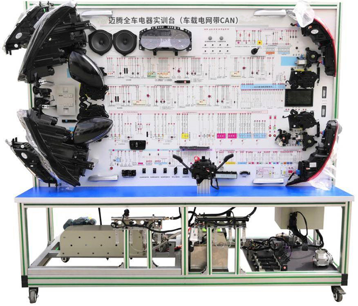 2.設備面板采用耐創(chuàng )擊、耐污染、防火、防潮的高級鋁塑板,表面經(jīng)特殊工藝噴涂底漆處理;面板打印有永不褪色的彩色電路圖;學(xué)員可直觀(guān)對照電路圖和實(shí)物,認識和分析汽車(chē)整車(chē)電器各系統的工作原理。