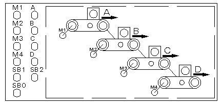 A、B、C、D為故障模擬按鈕,分別模擬M1、M2、M3、M4發(fā)生故障時(shí)的情況。例如:當要模擬M1條皮帶機發(fā)生故障時(shí),只需按下按鈕A即可,此時(shí)該皮帶機立即停止工作,而該皮帶機以后的皮帶機分別間隔5秒再依次停止工作:M2在M1停止工作后5秒以后再停止(將本皮帶上的貨物運送待運完后才停止)。M3在M2停止工作后5秒以后再停止。往后依次類(lèi)推。當M2發(fā)生故障時(shí),M1皮帶機立即停止工作,而M2以后的皮帶機則依次間隔5秒以后再停止工作。M3、M4發(fā)生故障時(shí)情況與此相同。