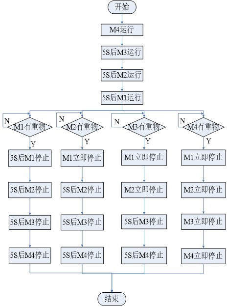 2.為防止物料在皮帶上滯留,應按照物料傳送方向順序停車(chē),停止順序為M1、M2、M3、M4,間隔5秒。