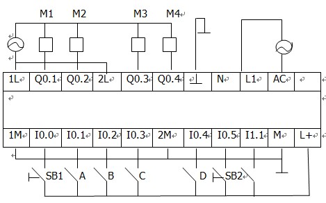 M1、M2、M3、M4分別接主機的輸出點(diǎn)Q0.1、Q0.2、Q0.3、Q0.4;SB1、SB2分別接主機的輸入點(diǎn)I0.0、I0.5;表示故障或重物設定的A、B、C、D分別接主機的輸入點(diǎn)I0.1、I0.2、I0.3、I0.4。啟動(dòng)用按鈕SB1實(shí)現,停止用按鈕SB2實(shí)現。故障或重物設置用撥動(dòng)開(kāi)關(guān)I1.1來(lái)模擬,電機的停轉或運行用發(fā)光二級管來(lái)模擬。