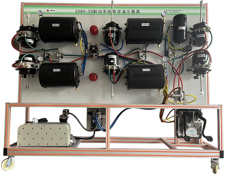 1.臺架上具有的全新天錦EQ1120GA原車(chē)零部件有空氣壓縮機總成、空氣干燥劑、前橋儲氣筒、后橋儲氣筒、手制動(dòng)儲氣筒、再生儲氣筒、輔助儲氣筒、四回路保護閥、制動(dòng)腳閥、駐車(chē)閥、ABS電磁閥、繼動(dòng)閥、制動(dòng)管路、氣壓表若干個(gè)。