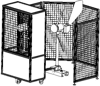 葉片、輪轂、發(fā)電機、機艙、尾舵和側風(fēng)偏航控制機構組裝成水平軸永磁同步風(fēng)力發(fā)電機,安裝在塔架上。風(fēng)場(chǎng)由軸流風(fēng)機、軸流風(fēng)機支架、軸流風(fēng)機框罩、測速儀、測速儀支架、風(fēng)場(chǎng)運動(dòng)機構箱體、傳動(dòng)齒輪鏈機構、單相交流電動(dòng)機、滾輪和萬(wàn)向輪等組成。軸流風(fēng)機和軸流風(fēng)機框罩安裝在風(fēng)場(chǎng)運動(dòng)機構箱體上部,傳動(dòng)齒輪鏈機構、單相交流電動(dòng)機、滾輪和萬(wàn)向輪組成風(fēng)場(chǎng)運動(dòng)機構。當風(fēng)場(chǎng)運動(dòng)機構中的單相交流電動(dòng)機旋轉時(shí),傳動(dòng)齒輪鏈機構帶動(dòng)滾輪轉動(dòng),風(fēng)場(chǎng)運動(dòng)機構箱體圍繞風(fēng)力發(fā)電機的塔架作圓周旋轉運動(dòng),當軸流風(fēng)機輸送可變風(fēng)量風(fēng)時(shí),在風(fēng)力發(fā)電機周?chē)纬娠L(fēng)向和風(fēng)速可變的風(fēng)場(chǎng)。