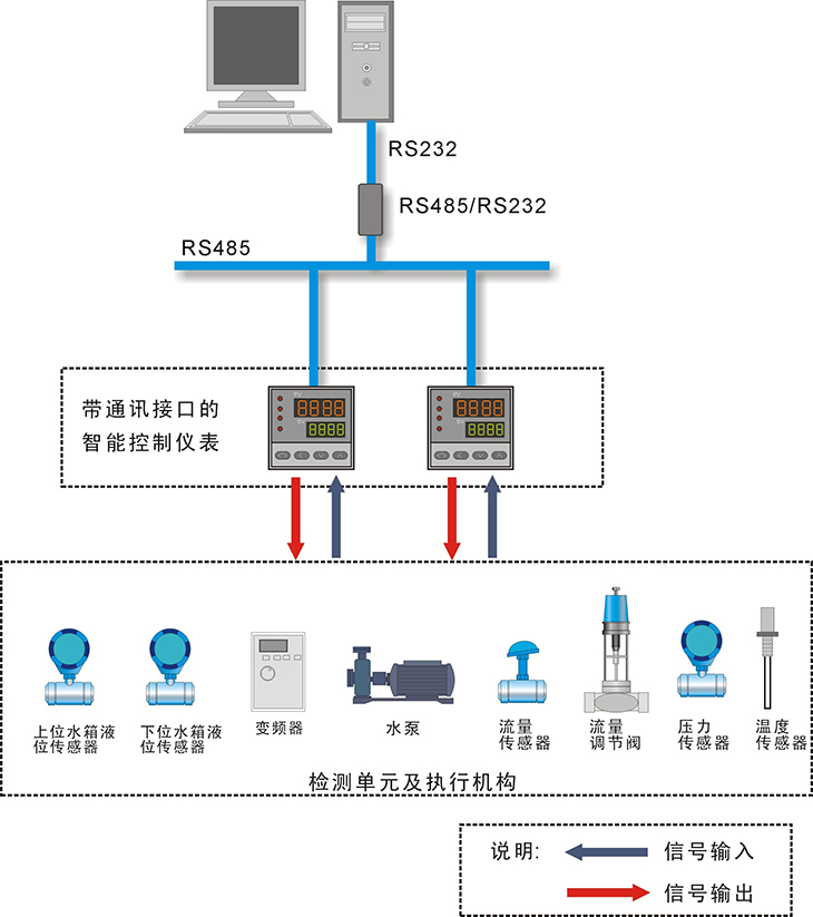 儀表控制系統核心為帶通信功能的各種儀表,儀表內集成了各種算法,根據現場(chǎng)情況整定儀表控制算法的各種參數,達到控制效果。同時(shí)帶通訊功能的儀表與上位計算機的軟件平臺通訊。儀表各種參數和過(guò)程值進(jìn)入軟件平臺(一般為工控組態(tài)軟件)的數據庫,再加上組態(tài)的流程畫(huà)面和操作界面,可以方便在上位計算機整定參數,對過(guò)程值進(jìn)行記錄分析。