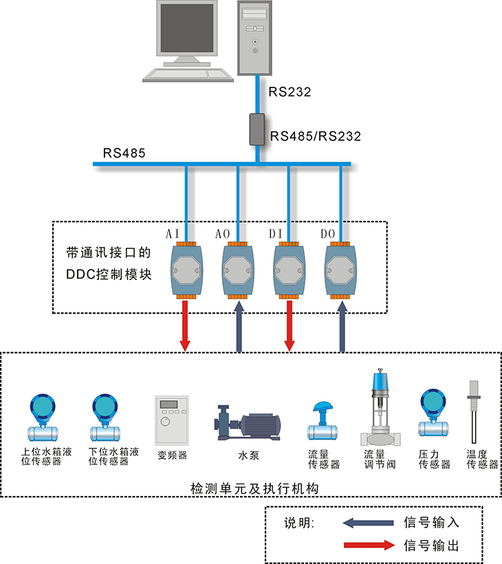 DDC控制系統一般有兩種形式,一種采用外部數據采集模塊的形式,其核心為帶RS485通訊的數據采集模塊和計算機算法軟件;另一種采用工控機和ISA或PCI插槽的數據采集板卡。外部數據采集模塊由于安裝方便,同時(shí)就地安裝時(shí)采用通訊方式向計算機送數據不存在信號衰減,因此本產(chǎn)品采用第一種方式的應用。用戶(hù)可根據自己學(xué)校的實(shí)際情況選用第二種方式的應用(例如研華A/D、D/A、采樣板卡)。