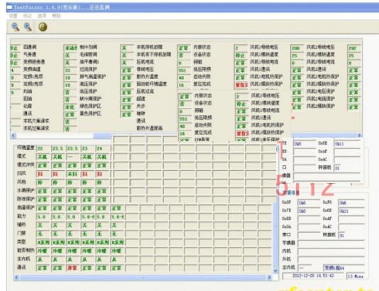 1、中央空調測試程序:中央空調機由于工程復雜,設備分散,有的已經(jīng)裝修在開(kāi)花板上測試程序,一但出現了故障,工程量相當大,為了能夠快速準確地測出故障是由主機機組還是室內機的故障的,每個(gè)生產(chǎn)廠(chǎng)家根據生產(chǎn)的和維修的需要而開(kāi)發(fā)了中央空調測試程序?蓽y試壓縮機的運轉頻率,傳感器的各種數據,電子膨脹閥的工作步數等幾十種中央空調的工作數據和狀態(tài),軟件可實(shí)現對內機的控制,,可以對1-64臺內機的狀態(tài)進(jìn)行設定。是高校提供了好的研究的學(xué)習設備。