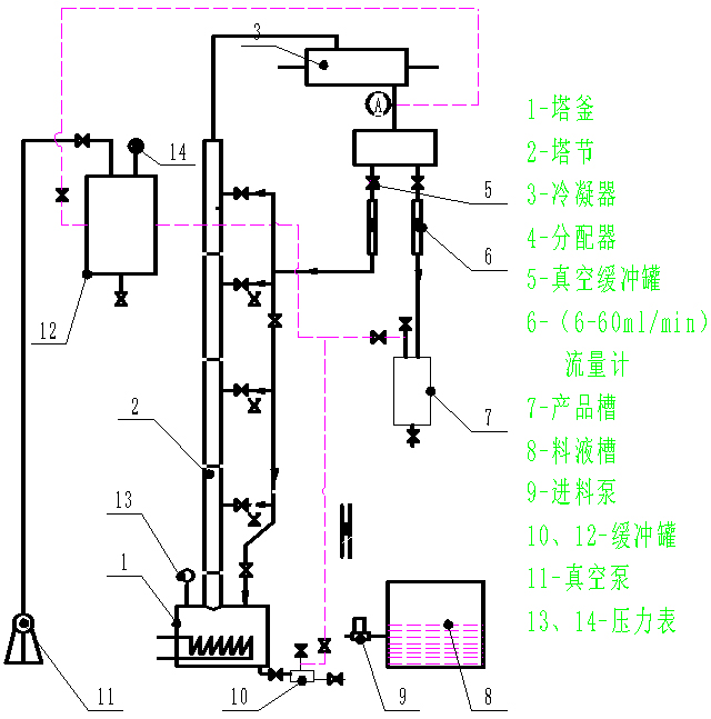 1、本實(shí)驗裝置主要由真空系統、真空緩沖罐、精餾塔、冷凝器、再沸器、料液泵、回流泵、壓力表、產(chǎn)品罐、原料罐、流量計、溫度儀表、溫度傳感器、316不銹鋼管道和閥門(mén)及保溫材料等組成。