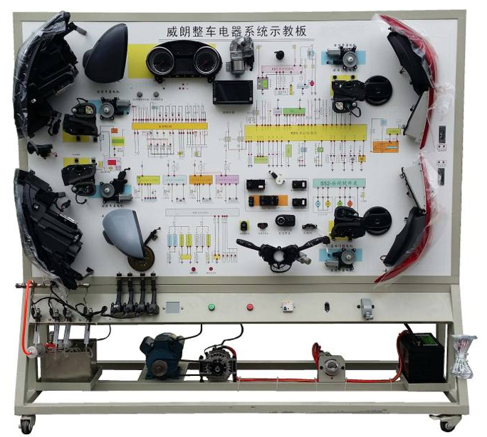 2.設備面板采用耐創(chuàng )擊、耐污染、防火、防潮的高級鋁塑板,表面經(jīng)特殊工藝噴涂底漆處理;面板打印有永不褪色的彩色電路圖;學(xué)員可直觀(guān)對照電路圖和實(shí)物,認識和分析汽車(chē)整車(chē)電器各系統的工作原理。