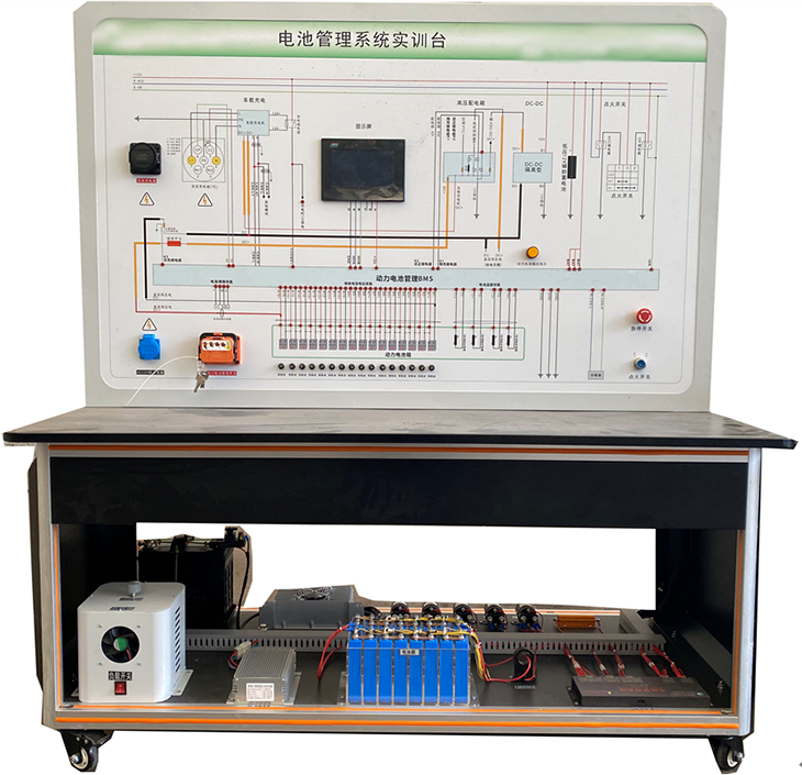 磷酸鐵鋰動(dòng)力電池包、實(shí)驗連接導線(xiàn)、BMS鋰電管理系統模塊、7寸動(dòng)力電池包觸摸顯示屏、車(chē)載充電機、國標充電插口、國標充電槍、緊急斷電開(kāi)關(guān)、霍爾電流傳感器、直流接觸器(包含充電繼電器、總正繼電器、總負繼電器、預充繼電器)、DC-DC轉換器、輔助蓄電池(12V45AH)、放電控制繼電器與放電負載、預充電阻、一體化全鋁合金型材搭建的移動(dòng)臺架(1600×700×1700mm 帶自鎖腳輪裝置,帶安裝檢測端子的原理面板)。