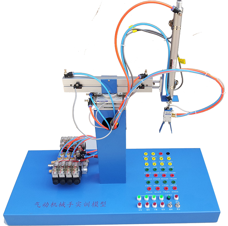 氣動(dòng)機械手實(shí)訓模型是一套完整的氣動(dòng)機械手搬運裝置,由安裝底板、氣動(dòng)手指、單桿提升氣缸、雙導桿伸縮氣缸、旋轉擺動(dòng)氣缸、多種類(lèi)型磁性傳感器、多種類(lèi)型電磁閥、空氣過(guò)濾器、氣源控制滑閥及接線(xiàn)端子排等組成。
