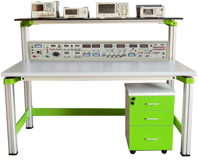 電源儀表控制屏箱體采用鐵質(zhì)雙層亞光密紋噴塑結構,鋁質(zhì)面板。左邊是安全控制、交直流電源、信號源、測量電表等;電源儀表控制屏箱底部裝有日光燈,用作日光燈實(shí)驗。右邊是示波器等儀器放置箱,并配有多組外部?jì)x器交流工作電源箱。