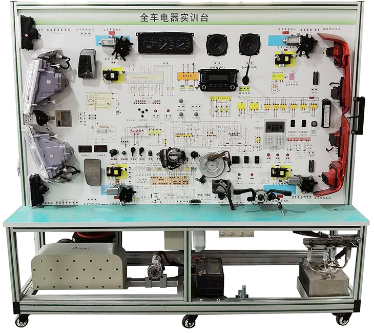 2.設備面板采用耐創(chuàng )擊、耐污染、防火、防潮的高級鋁塑板,表面經(jīng)特殊工藝噴涂底漆處理;面板打印有永不褪色的彩色電路圖;學(xué)員可直觀(guān)對照電路圖和實(shí)物,認識和分析汽車(chē)整車(chē)電器各系統的工作原理。
